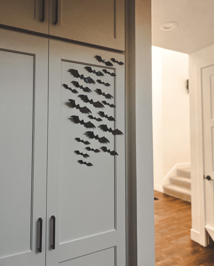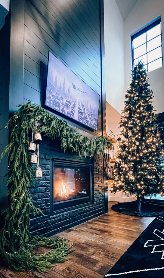 I used simple black ribbon from Target for bows on the garland, and the hanging brass bells from Walmart.