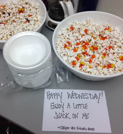 Random Acts of Kindness. On Wednesday, I dropped off a mixture of popcorn, candy corn and peanuts in our break room at work. I just wanted folks to enjoy the snack and know that others appreciate them, so I didn’t tell them who it was from (look closely at my note). Where my office is located is also where a large chunk of faculty offices are housed. They work their tails off and since it is mid-term time, things get stressful. I think they enjoyed the snack. The bowls were empty by the end of the day.