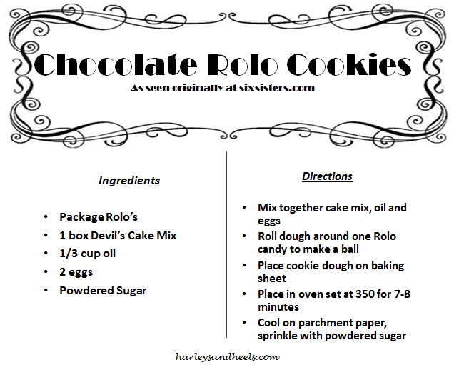 I am going to leave you with a Rolo Cookie Recipe that I again, only make once a year (like my Caramel Chex Mix), but these cookies only go to my Uncle Craig.  Well, they are made with the intent of just going to him, but my grandpa, aunt and cousins seem to always anticipate their arrival as well. 😉  I found this recipe originally on SixSisters.com.   Those chicks are my recipe heroes.