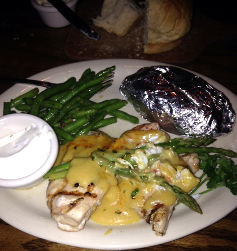 I had the Chicken Oskar – chicken, crab, asparagus and hollandaise sauce with a baked potato and green beans.