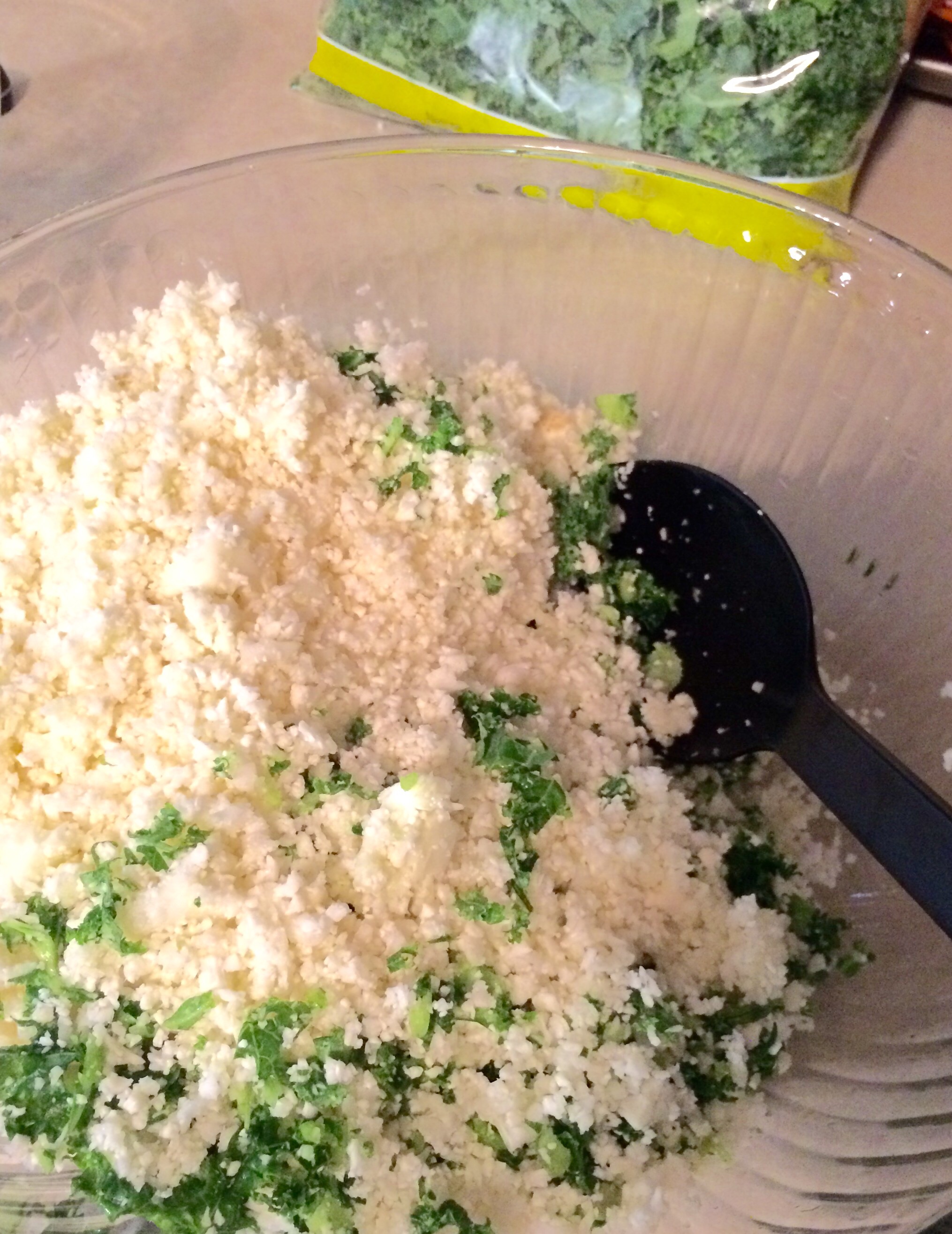 2. Chop Kale by hand or in food processor. Add to cauliflower.