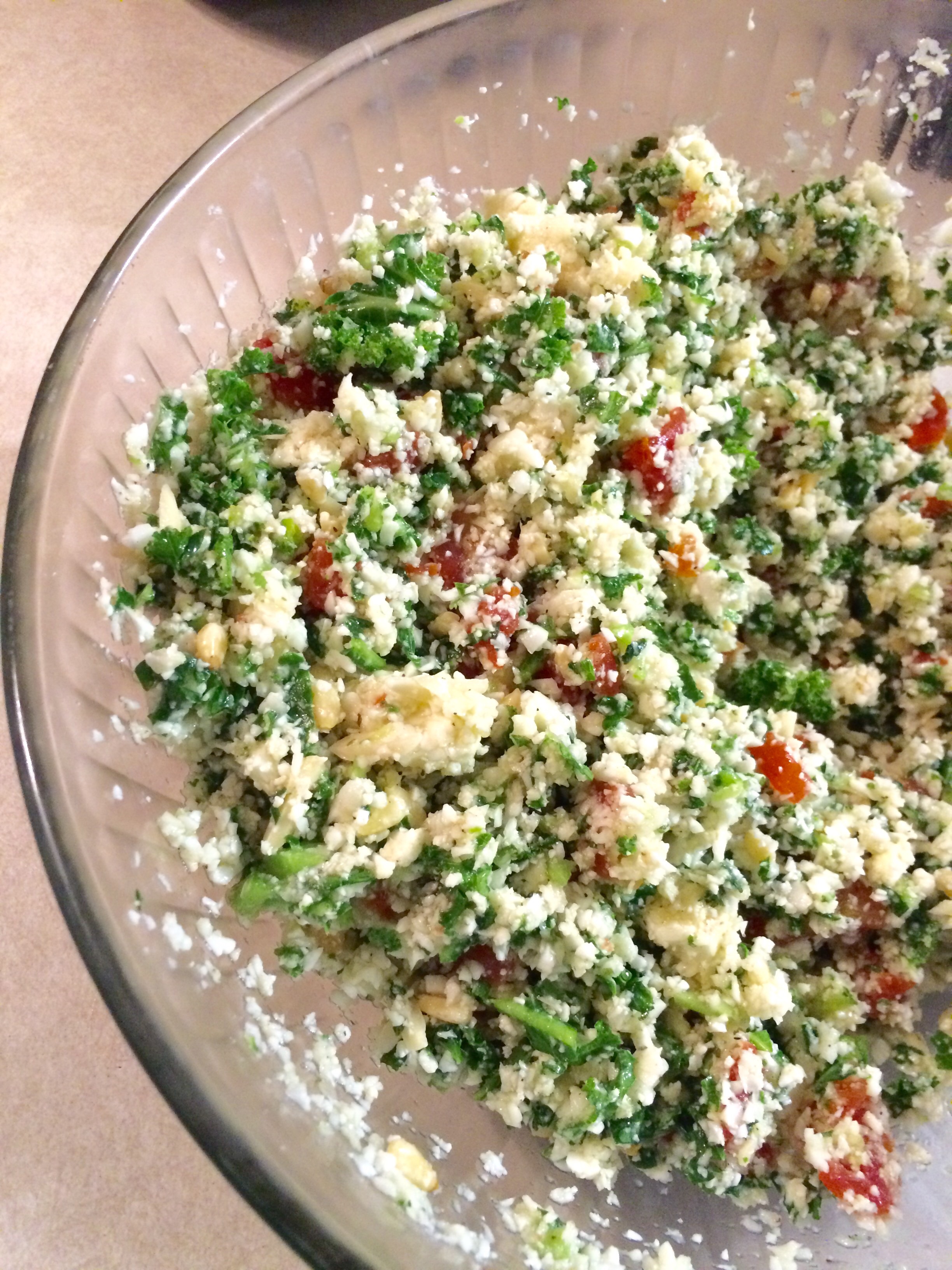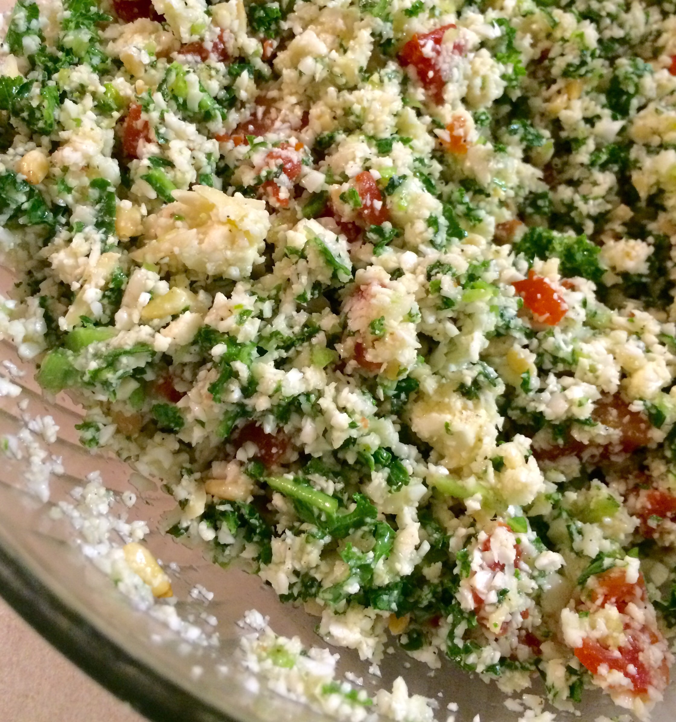 My friend Ashley made the original version of this salad a few weeks ago and was kind enough to bring me a container of it. I fell in love with the light, fresh taste and the overall health benefits this recipe packs. Did you know cauliflower, kale, basil and lemons are known for their detoxifying capabilities? After my weekend, this recipe was very appealing to me!