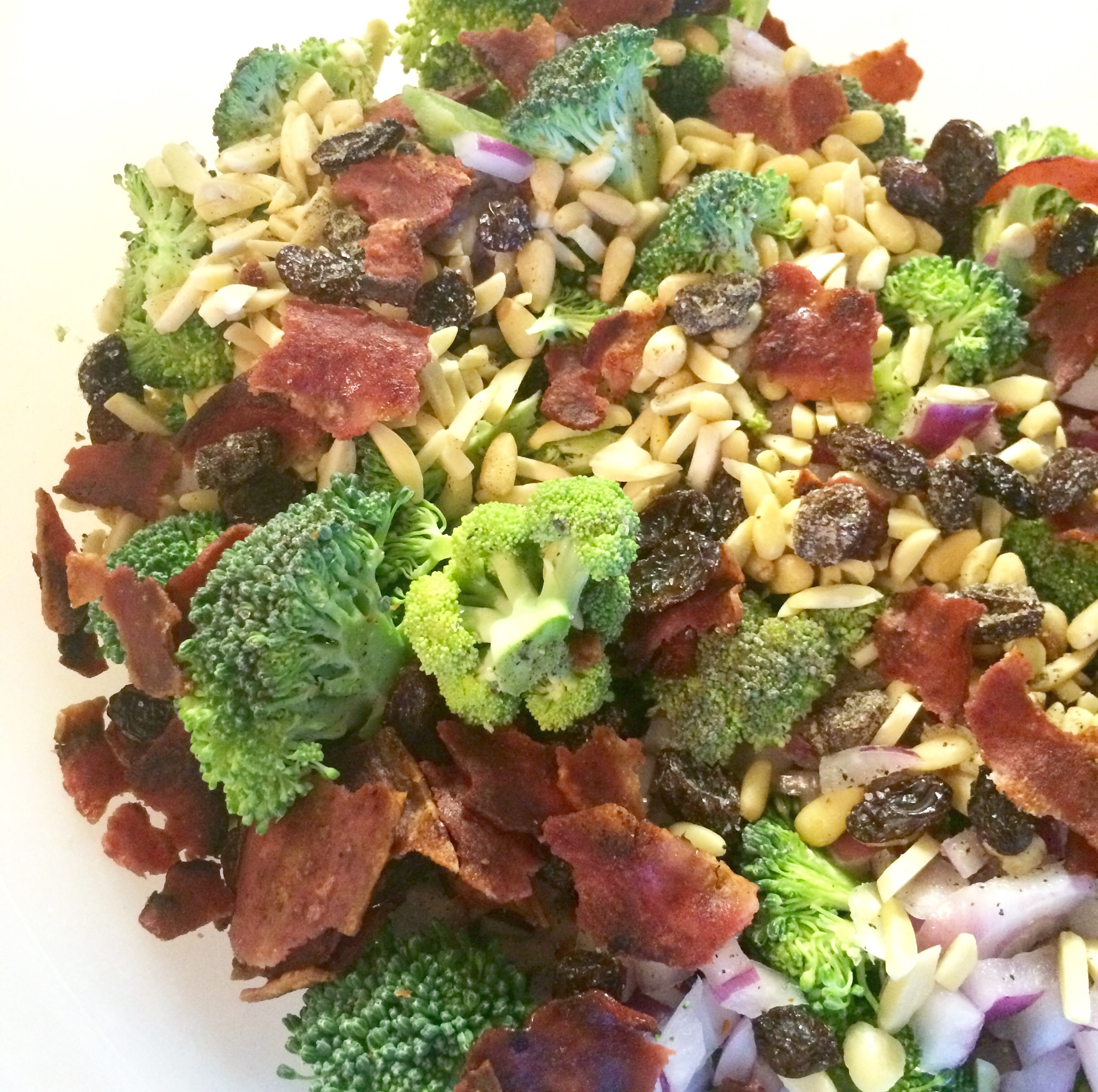- Combine broccoli, onion, raisins, turkey bacon, almonds and pine nuts in bowl.