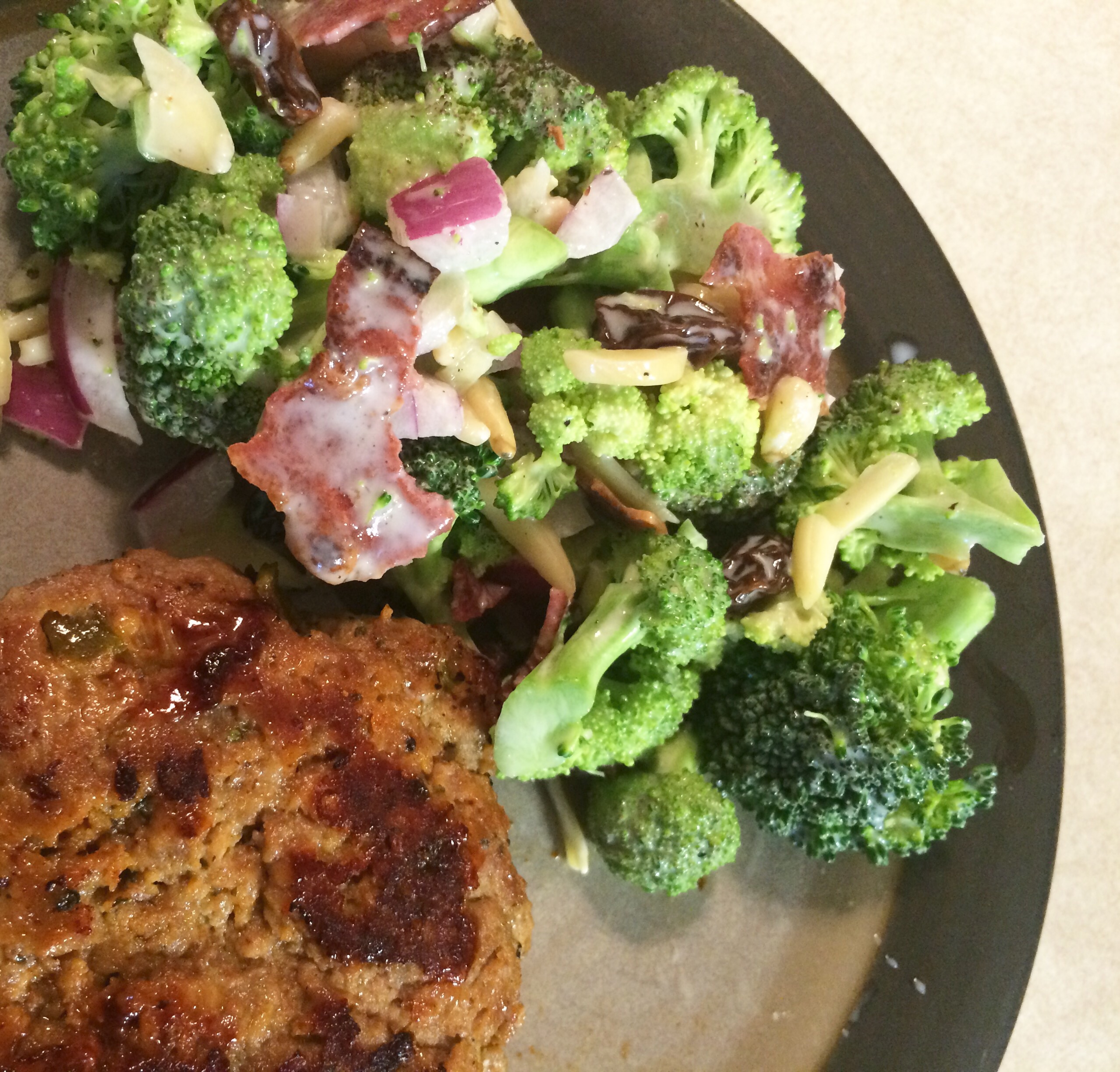 - Combine broccoli, onion, raisins, turkey bacon, almonds and pine nuts in bowl.