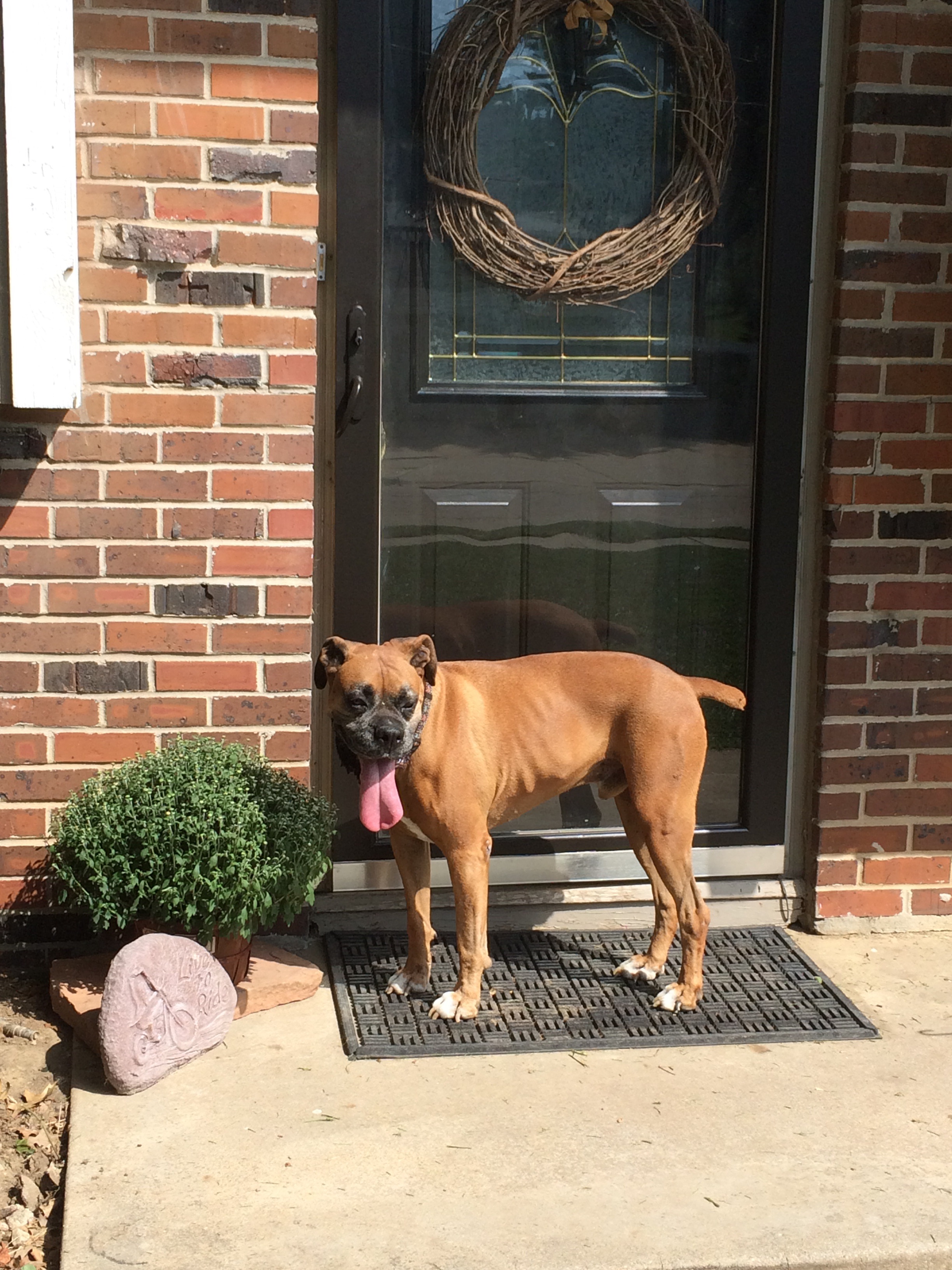 Earlier this summer, Clint and company poured a sidewalk and half of our patio in the back.   It wasn’t intentionally done this way, but measurements were a little off… NBD.   Eventually it will extend to where the dog houses are and curve back around.  Our fire pit (which is sitting on top of the ground for now) will go in the middle.