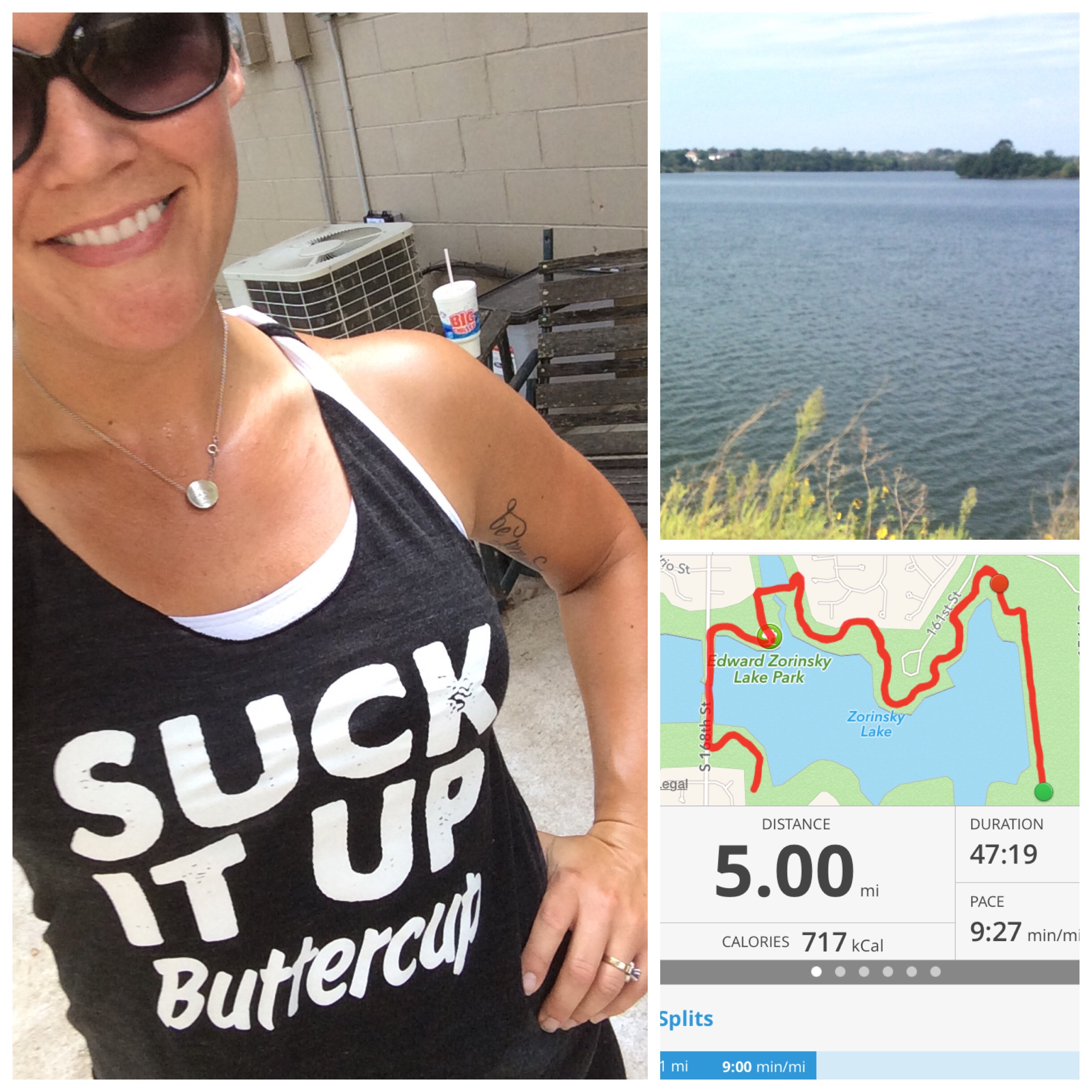 An insanely humid morning equaled a less than enthusiastic start to my day.  5 miles sounded daunting in that heat, so I pulled out my witty tank to garner some laughs out on the trail.   I always wave/nod/acknowledge anyone I meet while out on the trail, so figured adding a laugh would help keep me going, if not them too.
