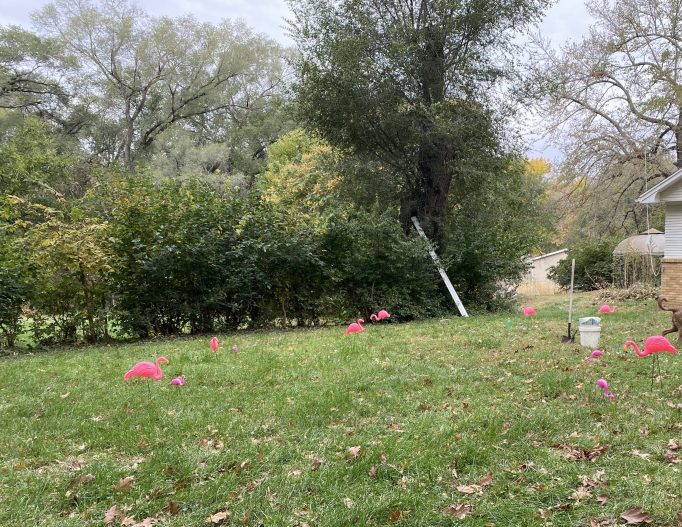 Back to flocking yards again. It takes time and patience. Arrangements had been made for an October girls trip to Weston, MO, and so a full year after the first flocking, our pink friends found their new nesting place at Jessica’s.